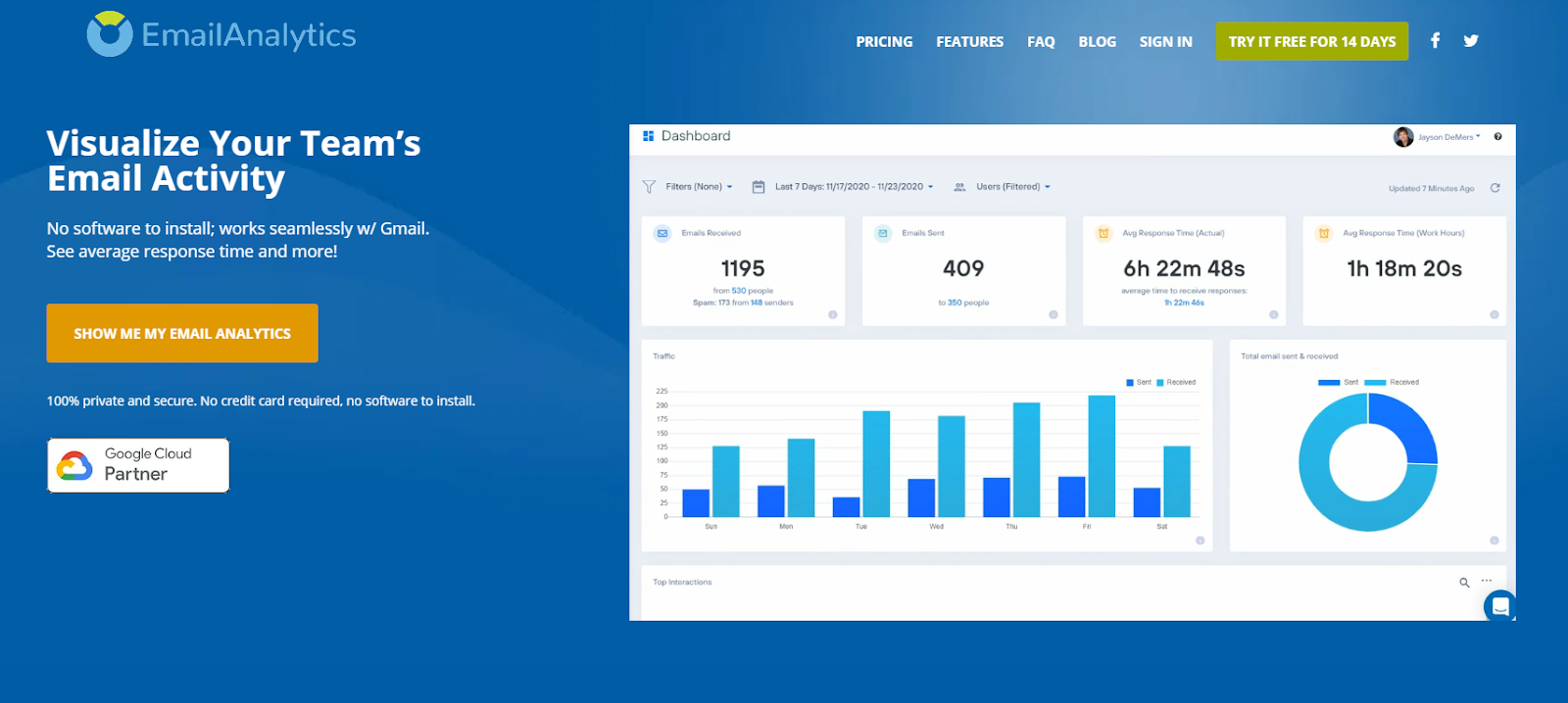 Gmail and Google Workspace support EmailAnalytics, and it is perfect for tracking your and your employees' email interactions. Its analytics show you your top senders, busiest times of the day, top recipients, etc. You can also get the average email response time and weekly or daily email activity reports that you can use to monitor your team's work.