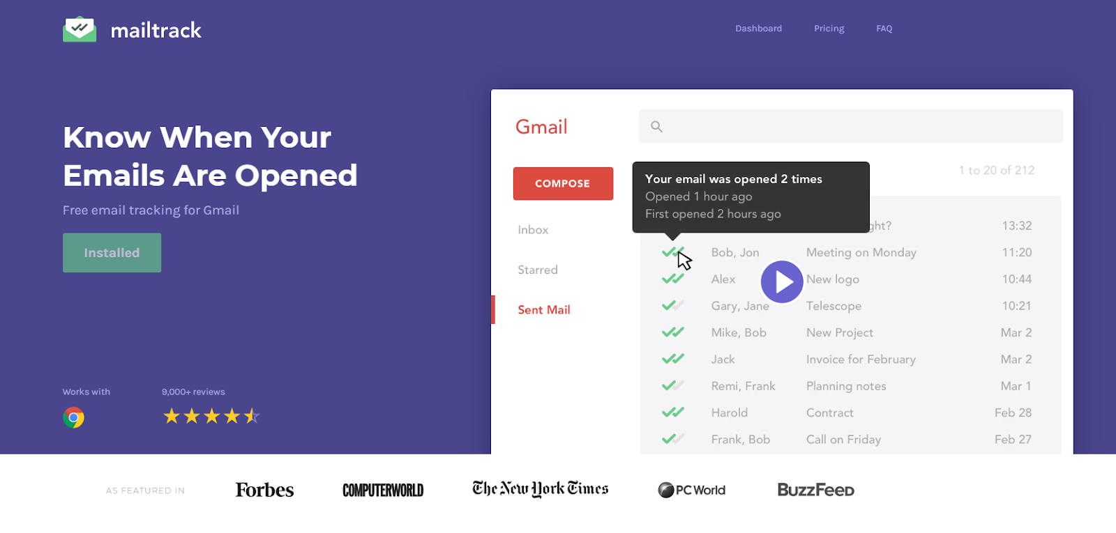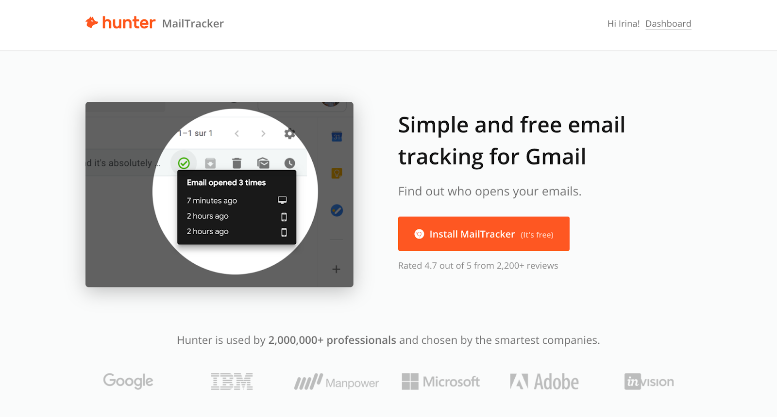 MailTracker from Hunter is a simple and free email tracking tool for Gmail. Once you install MailTracker, you don’t need to guess whether your emails are opened and read. As soon as your recipients open your emails, you can see the tracking details directly in your Gmail. MailTracker provides you with such information as when your email was opened, how many times, and from which device.