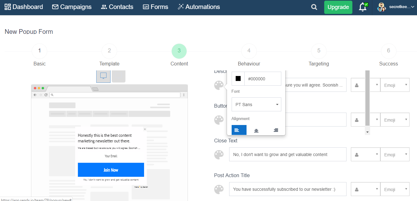 Go to the Content tab in the New Popup screen and add a suitable Title, Font Type and Font size.
