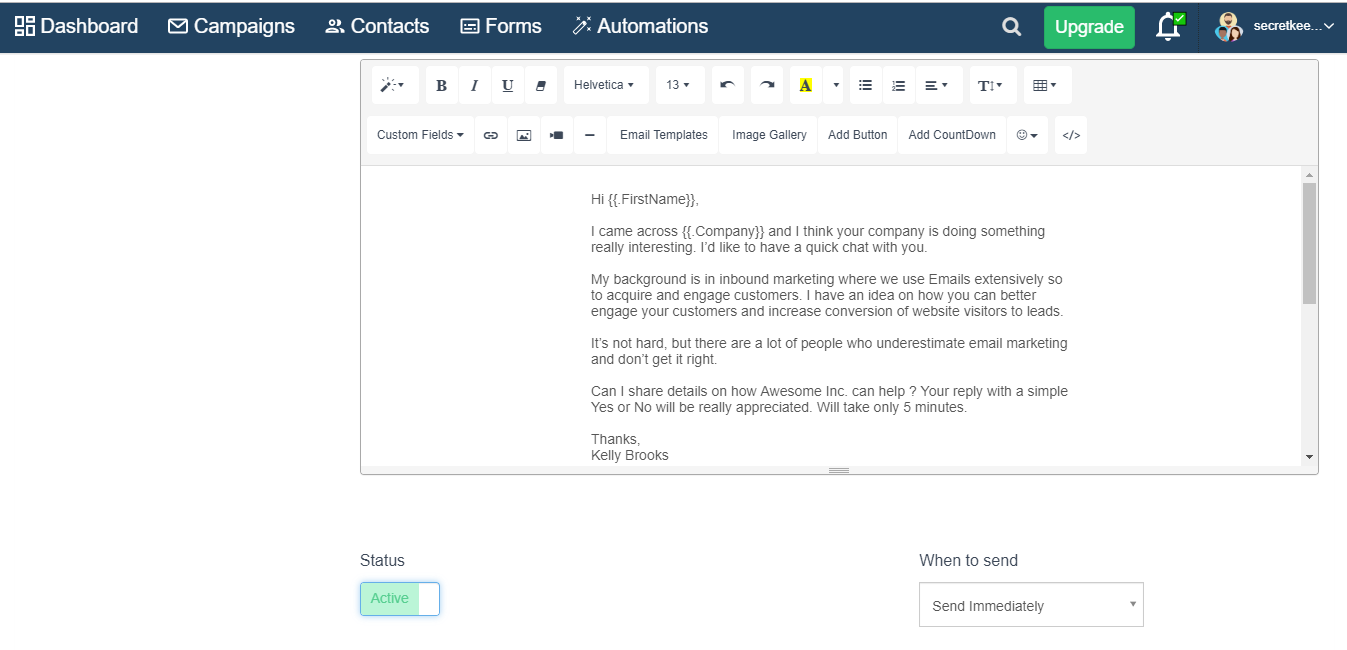 Under Contents you can Edit subject of your Drip Campaign and when you want to send your campaign, under content you have one more option i.e Status, you can keep the status to Active to send your campaign when schedule or you can Draft your campaign.