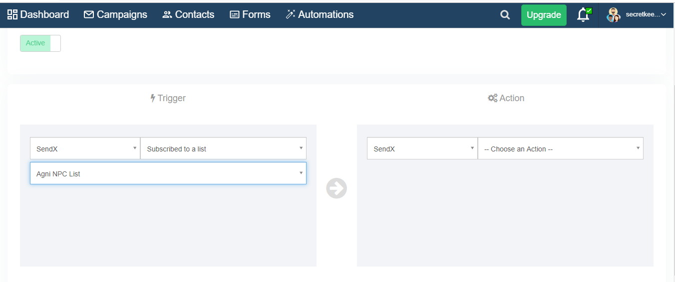 Under Trigger, make sure you have SendX selected in the field on the left hand side, and Subscribes to a list on the right field.