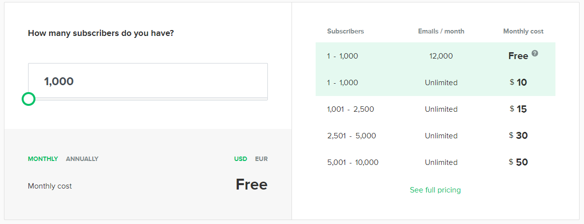 Mailchimp’s monthly paid plans start from $4.59 for 500 subscribers which keeps on hiking up with every 500 subscribers. This price hike could actually put holes in your pocket.