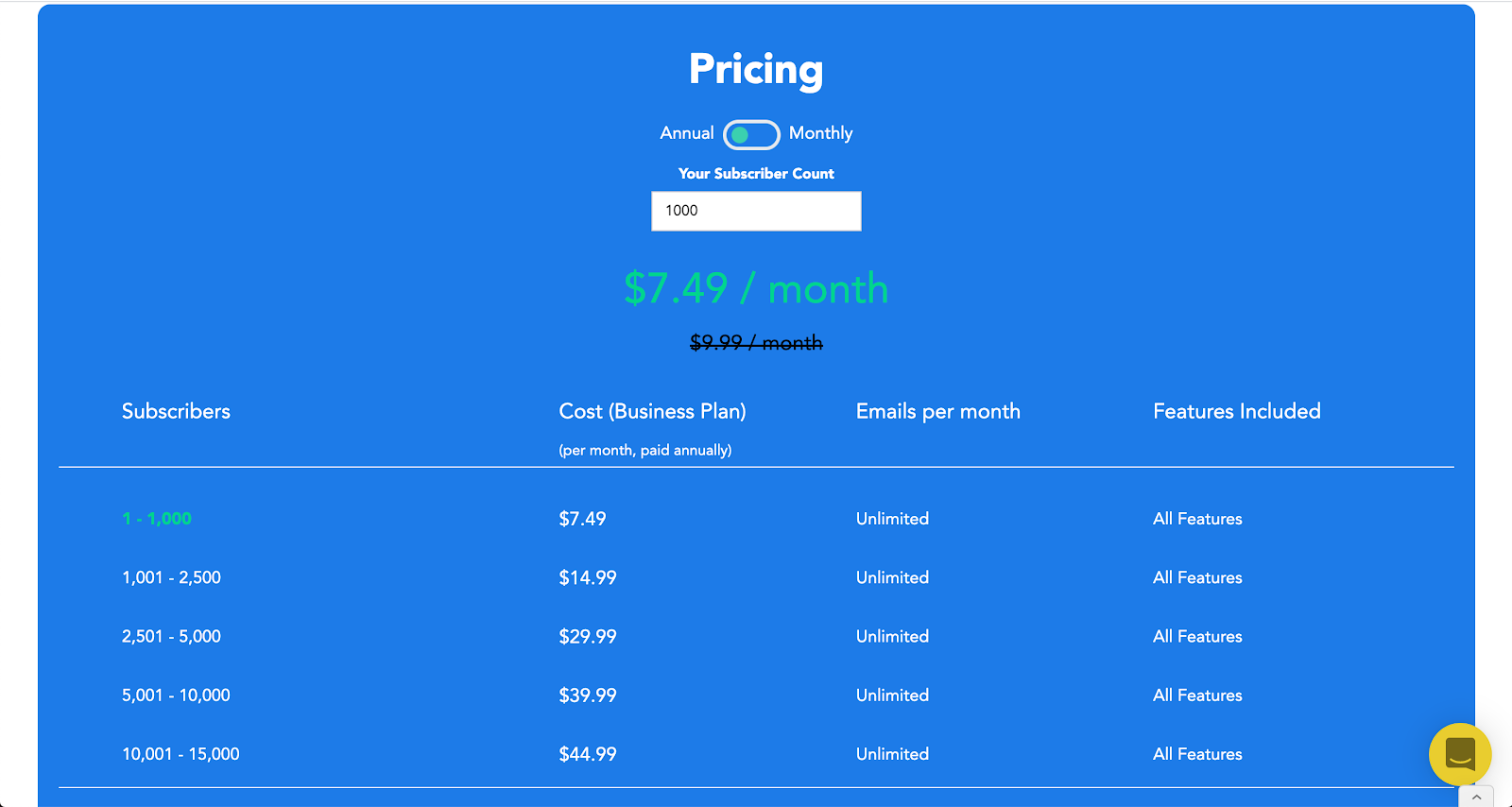It comes with unlimited email sends to your opted-in subscribers and it charges only for the subscribers that you have acquired without any email limits.