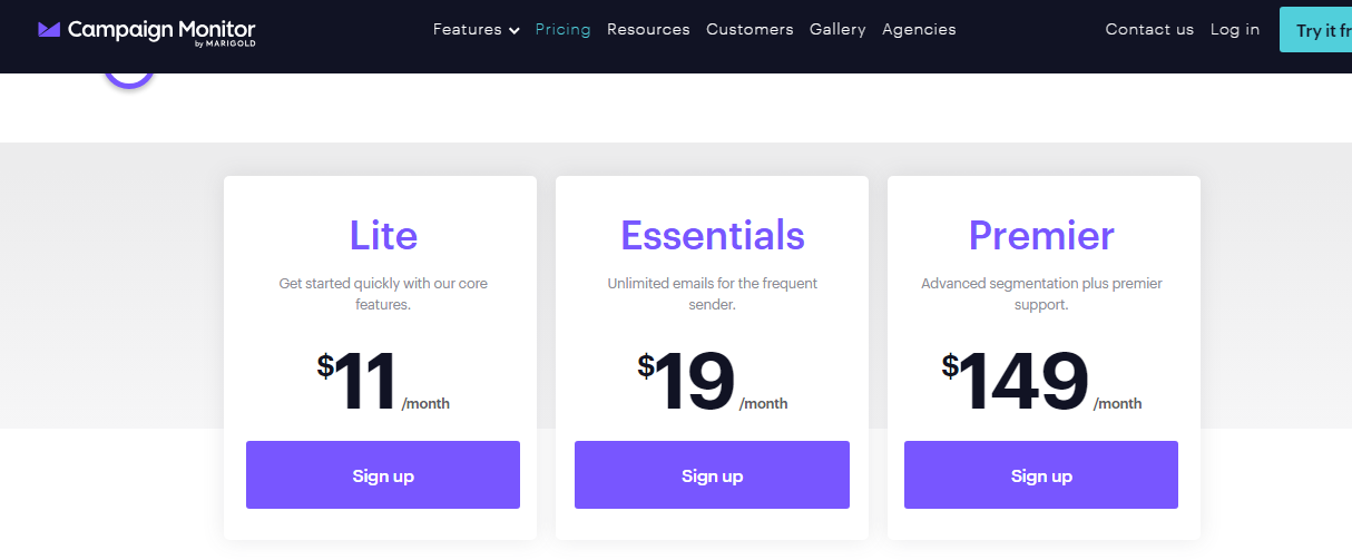 Campaign Monitor has 3 plans: Lite ($11/mo), Unlimited ($19/mo), Premier ($149/mo).