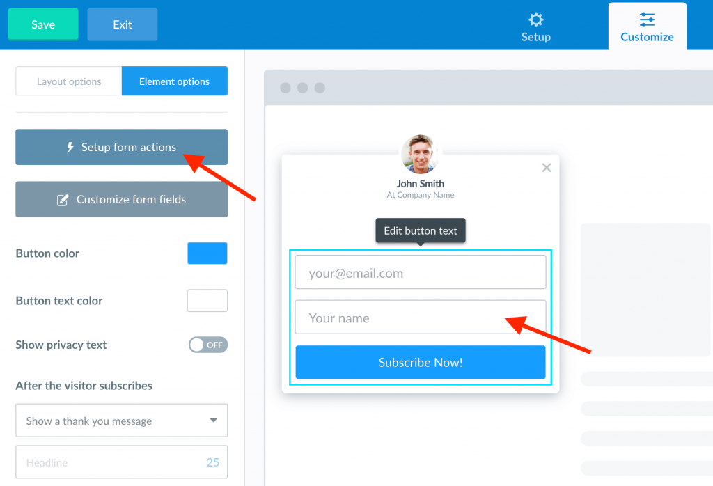 Edit your ConvertBox and select the form element you want to use webhooks with. Then on the left sidebar select the Setup form actions button.
