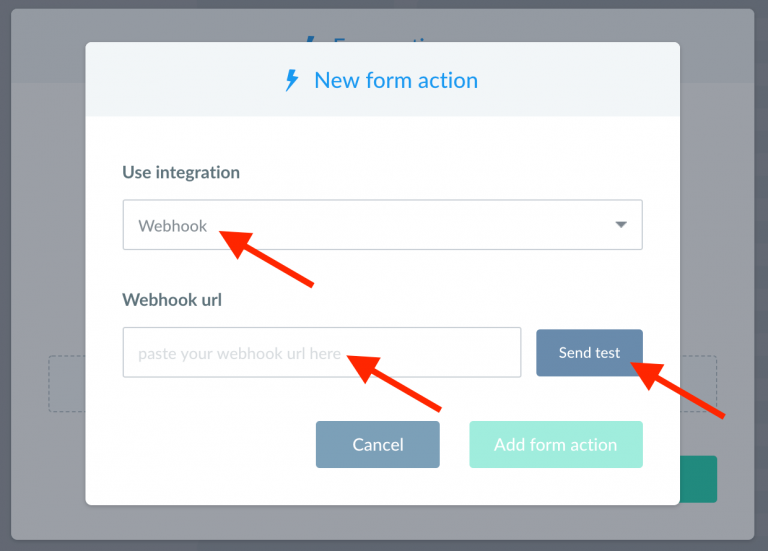 On the Use integration option select Webhooks then paste your webhook URL into the Webhook url field. Your webhook URL is https://app.sendx.io/api/v1/integration/convertbox/team/<team id> . You can find your team ID under Settings > Site Setup > Team ID. Now you can click the Send test button to send test data to your webhook URL for all the fields currently on your ConvertBox. Wait for the test to send (usually takes 1-3 seconds) and then click Add form Action