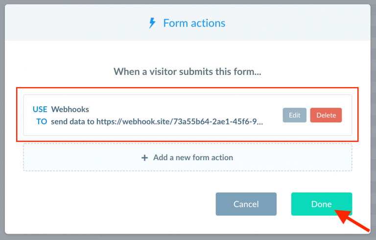 Your new Webhook action will now appear in your list of actions for this form. Click Done to close the Form actions modal and don’t forget to Save the changes to your ConvertBox in the editor.