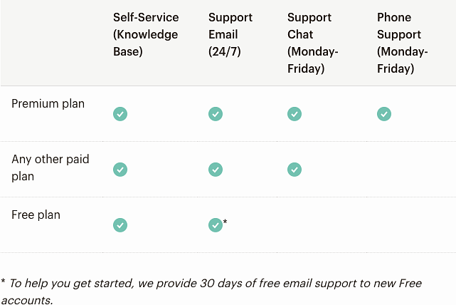 | Support | Live chat and email support is available to customers on all plans from 8a.m.-8p.m. EST Monday through Friday. Provides limited support via live chat and email at weekends | Has 30 day support via email on their free plan. Phone support available on paid plans only |