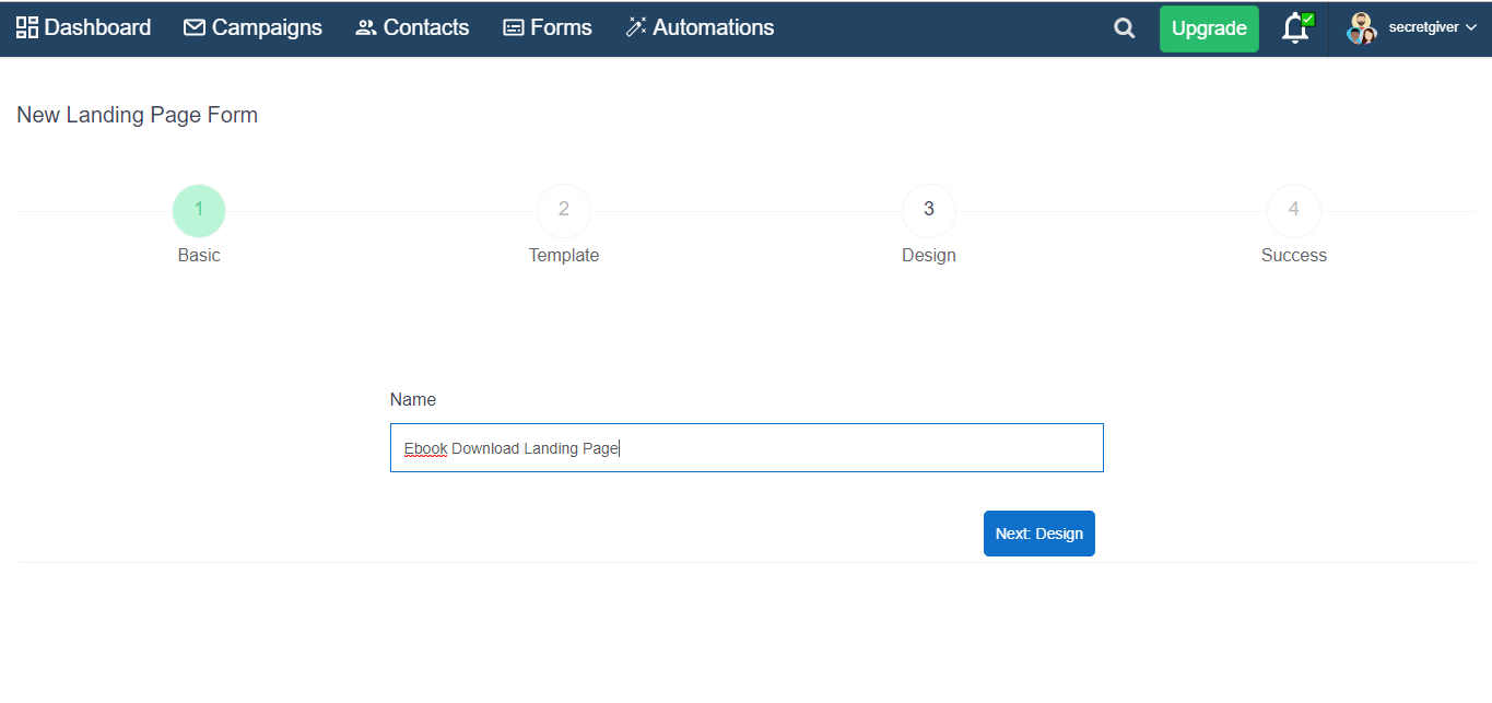 Go to Forms + Landing Pages Pane > New Landing Page, and you’ll be taken to the SendX Landing Page Creation Tool. In this guide, we will be creating a Landing Page titled 'Ebook Download Landing Page'.