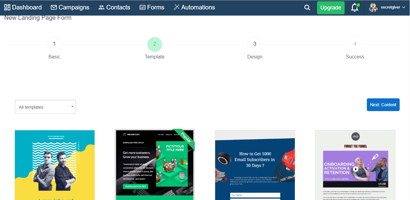After creating your landing page title, click “Next Design” at the bottom right corner of your screen. A new page will appear where you can select a desired template.