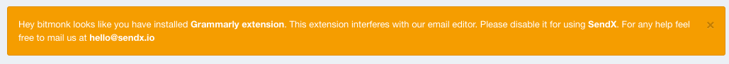 Grammarly is a chrome / safari extension for fixing spelling and grammatical mistakes. However this extension doesn't work properly with SendX. “We strongly recommend disabling the Grammarly extension if you use SendX.” In fact if you have the extension enabled we show you a warning too.