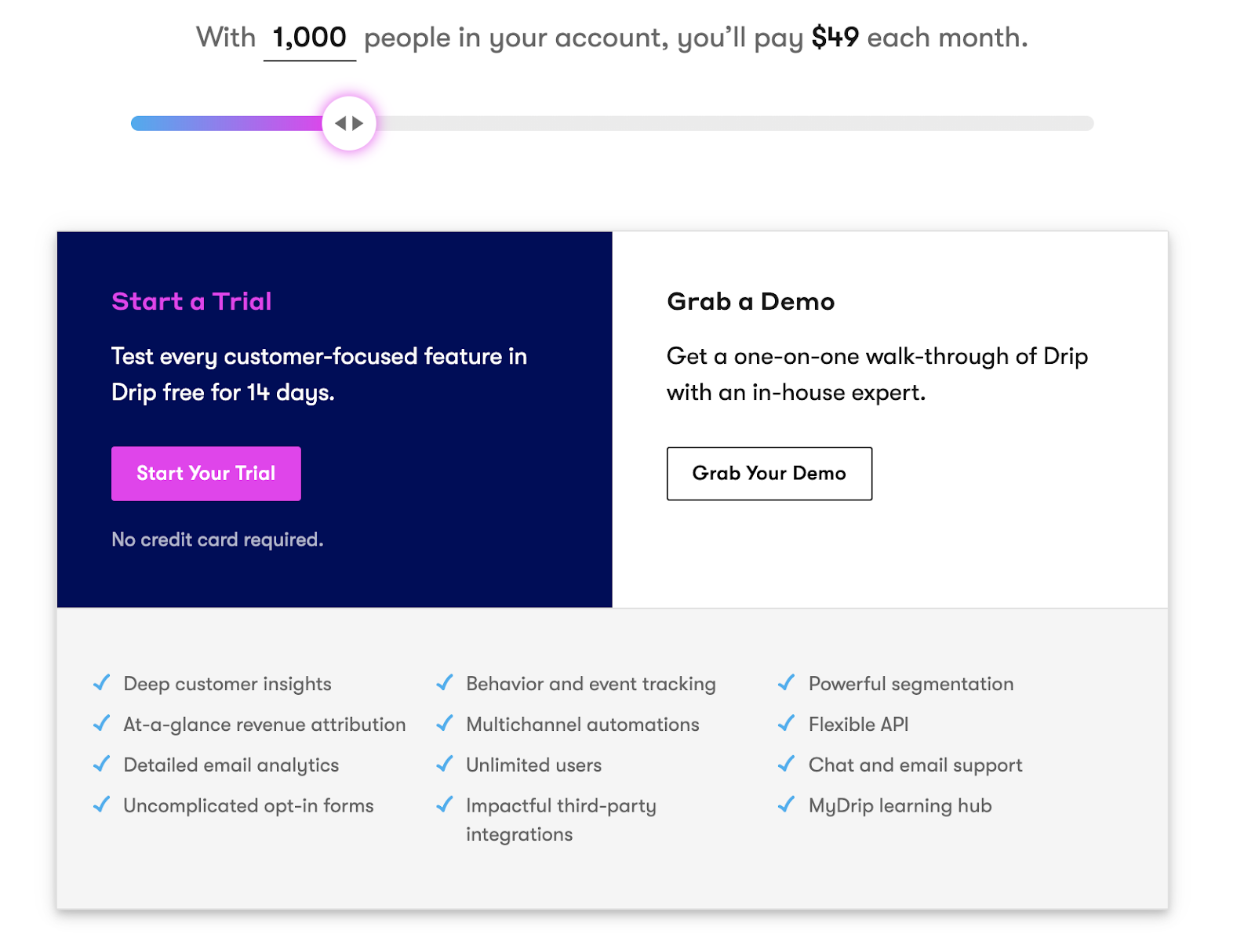 Likewise, you’re paying more than you need to for your package, Drip will automatically drop you to a lower-priced tier.