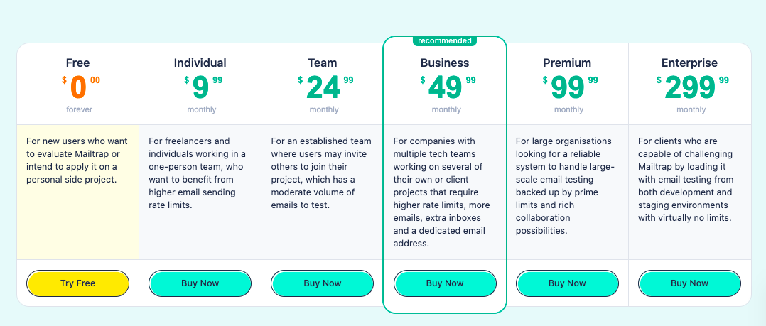 Mailtrap provides a forever free plan that allows you to test a total of 500 emails per month. The cheapest paid plan is for $9.99/month that allows you to test 5,000 emails per month.