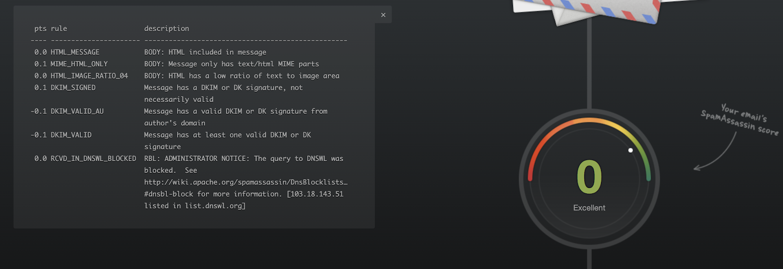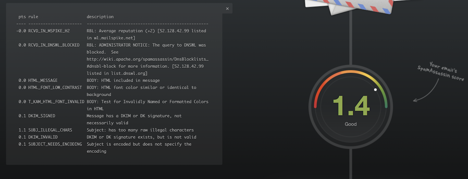 They also test authentication records like SPF and DKIM, sender IP address reputation, sender score, and message spam score. After the analysis, a detailed report about what elements in the email are increasing your spam score is sent to you.