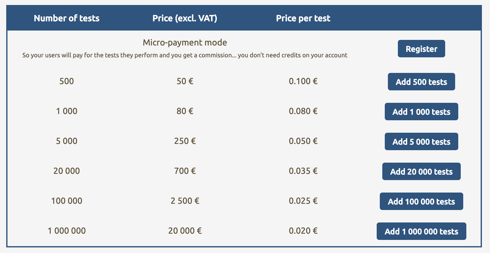 Fully white-label our service Get statistics about your tests (daily, weekly and monthly usage)