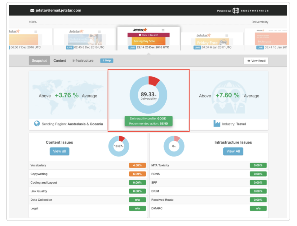 SendForensics also compares the results of all your tests, so you can quickly see if the changes you make in your copy and settings actually affect your deliverability in a positive or a negative way.