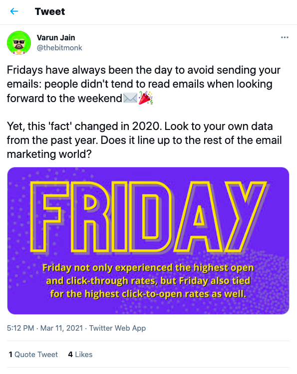 You must have heard this advice to choose Monday or Tuesday to send your emails as they are the best time to get maximum engagement. Here's a reasoning for that - on Monday people clear their pile of emails, take meetings etc., so Tuesdays are better. Thursday, because by then they are looking towards the weekend and have relaxed a bit into week's work. These might be good for infomercial sales emails or eCommerce emails.