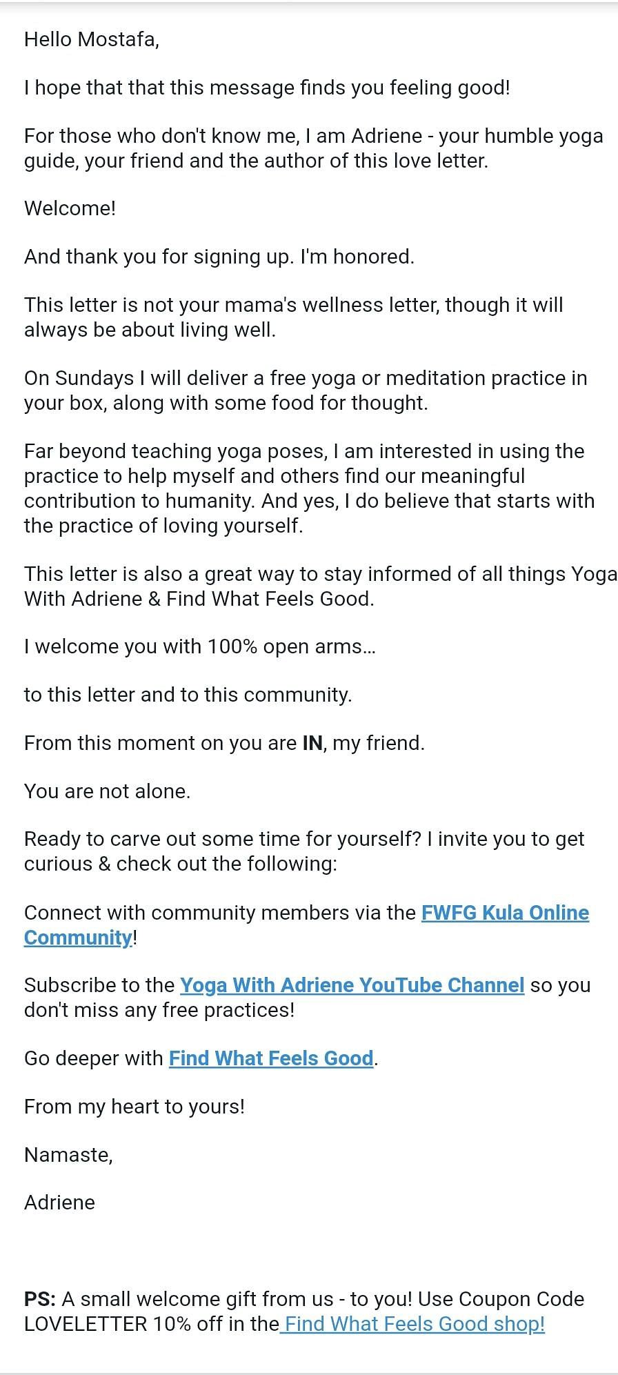 Here’s a proper welcome email by Yoga with Adriene. The email introduces the yoga instructor, Adriene, and what her mission is. It also gives a taste of her schedule and what the recipients should expect to receive from her. And finally invites the recipients to join her communities and start a conversation.