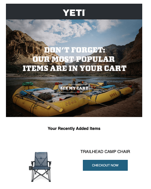 For example, the brand Yeti sends a retargeting email after 1 day of you leaving the items abandoned in their cart.