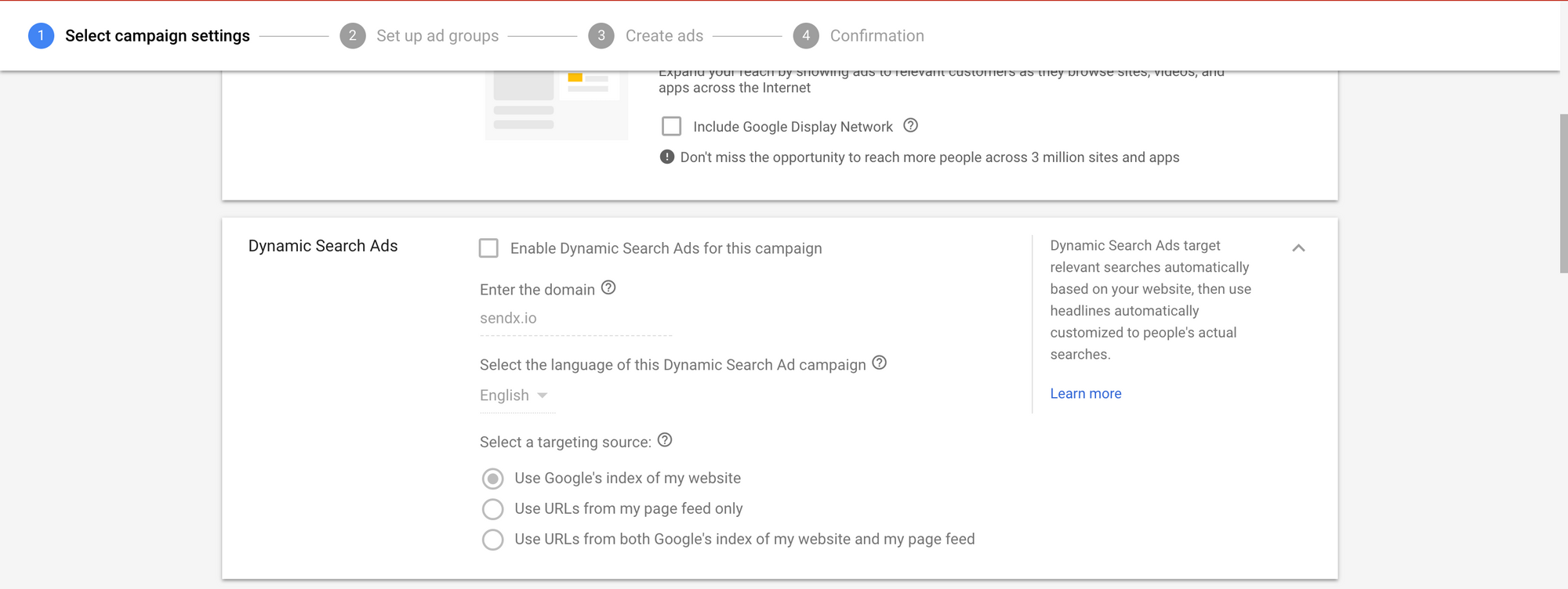 Right below that you will get the option to enable Google’s Dynamic Search Ads. These will basically modify your ad headline automatically, based on what the user searched. And the ad will be displayed automatically on searches based on the content of your website.