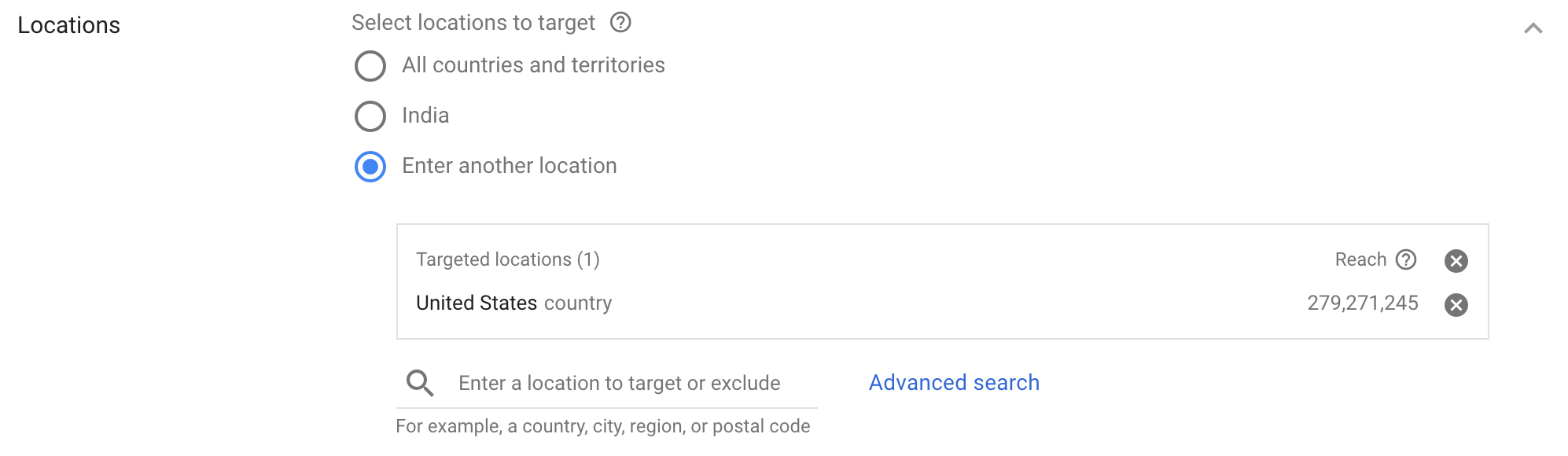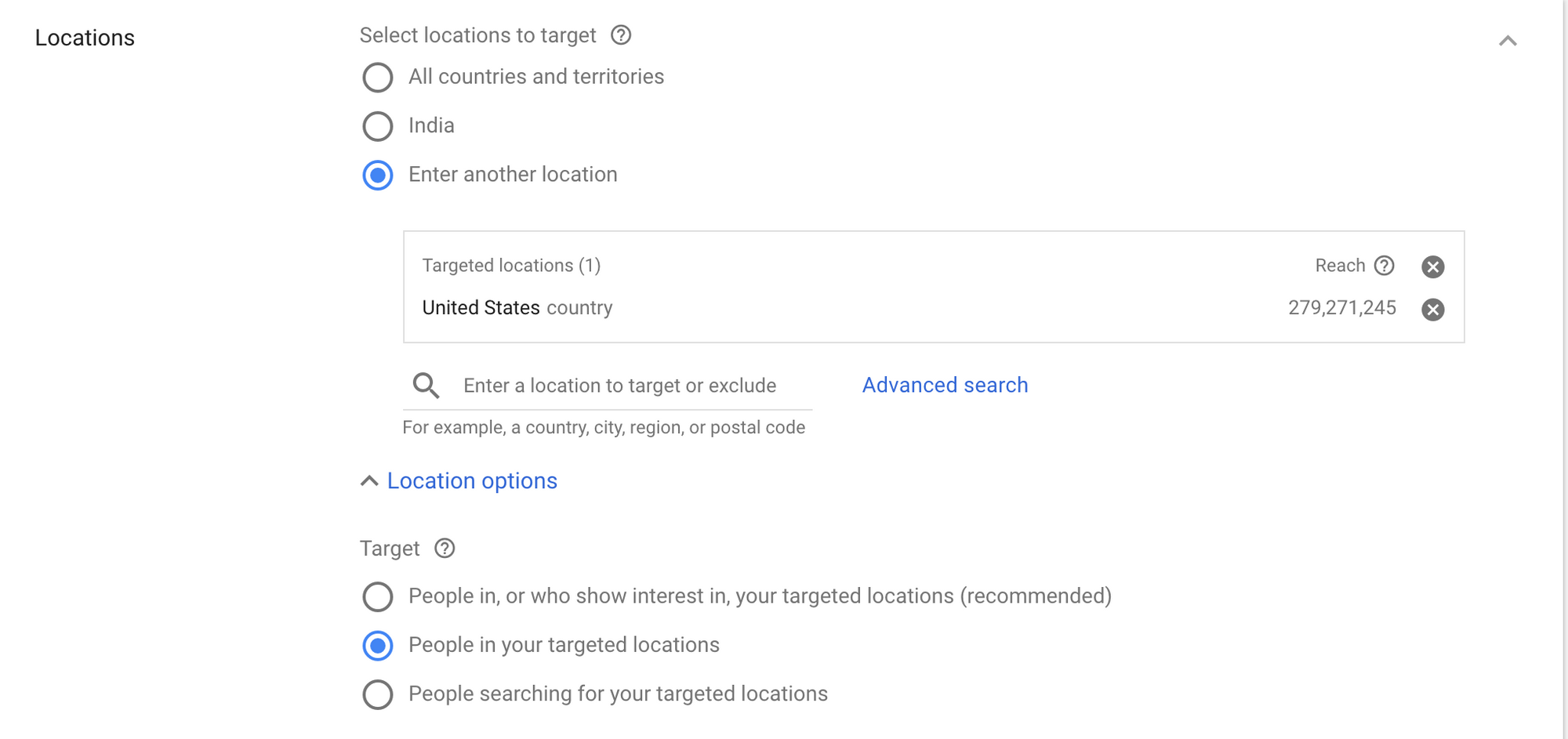 Next up, you get to choose the location you want to target with your ads. If your business sells mainly to the US, then there’s no reason to target Europe. Because even if you do get clicks, you won’t get your ideal customers.