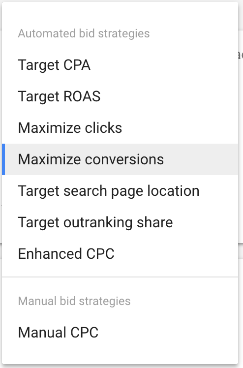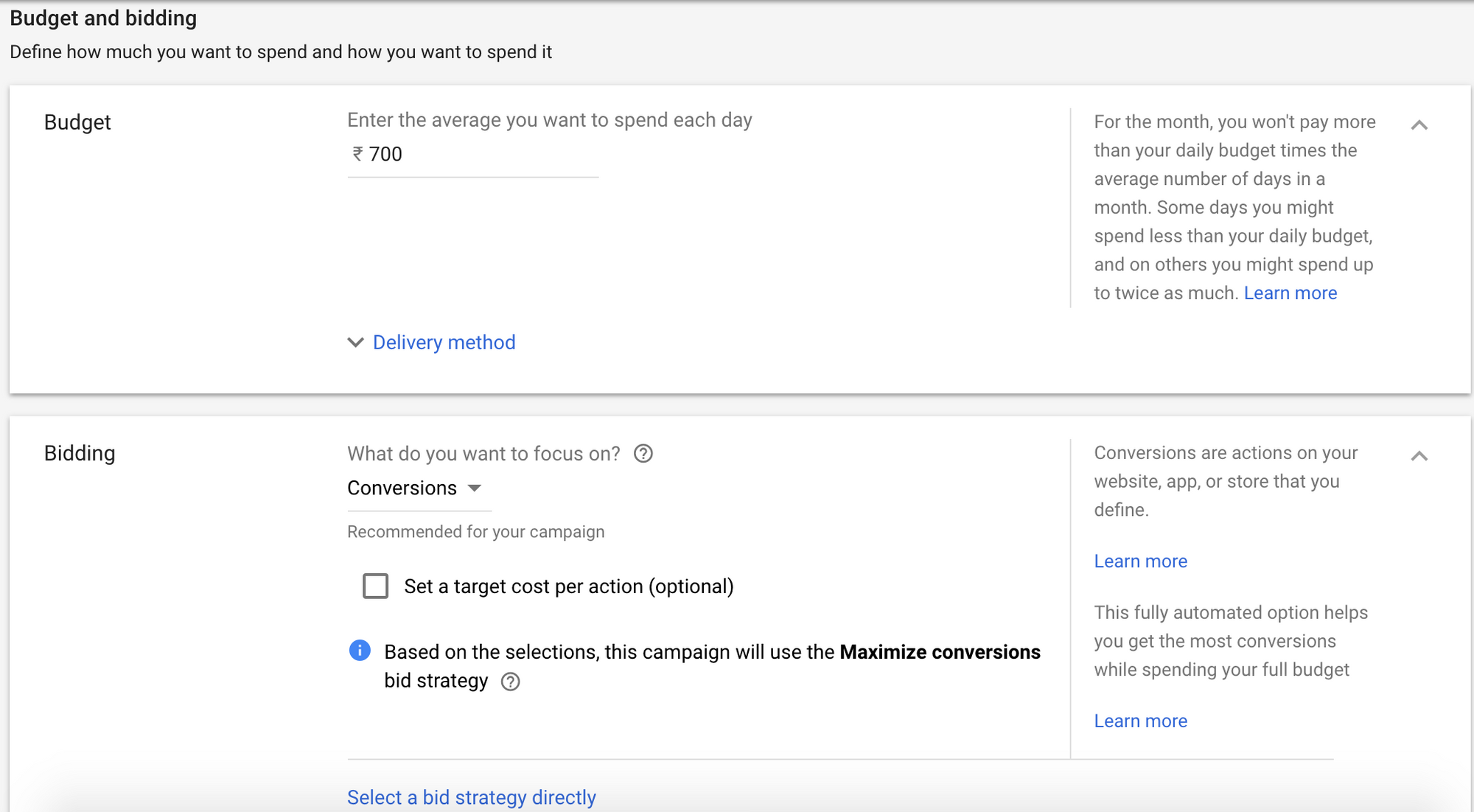 The Bidding section allows you to select the focus of your campaign. And a target CPA. Clicking on Select a bid strategy directly will allow you to choose from the multiple bidding strategies we talked about in the chapter on Bidding Strategies.