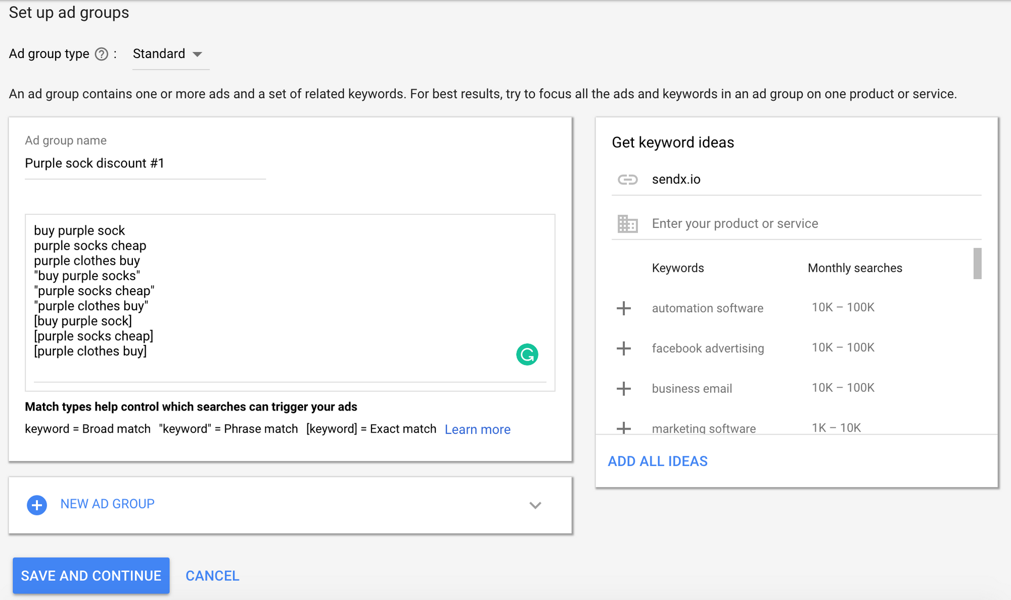 There are many ways you can setup the ad groups inside the campaign. You can choose to put a single keyword inside an ad group to micromanage the ads. Or you can choose to have one ad group for a particular match type.