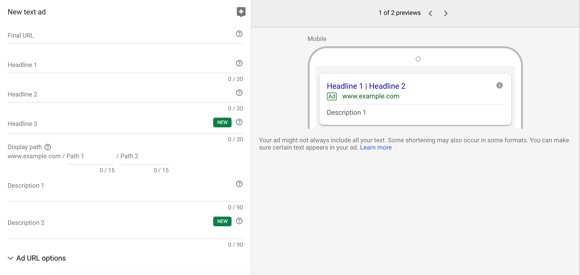 In Headline 1, Headline 2 and Headline 3, enter a suitable headline for the ad. Make sure you include your target keyword in it to maintain a good quality score.