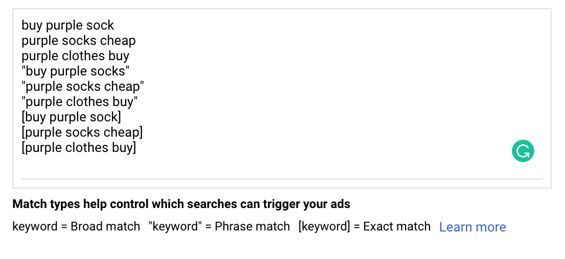 Any search query that uses any of the entered keywords would display the ad in this case. Ex: The keyword “purple socks” would show up on search queries like “why is the sun not purple” or “why does the sun not look like a sock”. Add a + before entering the keyword in your Google Ads dashboard to make sure it’s also included. So + purple would not show up on “why is a sock not a scarf” because “purple” is not included.