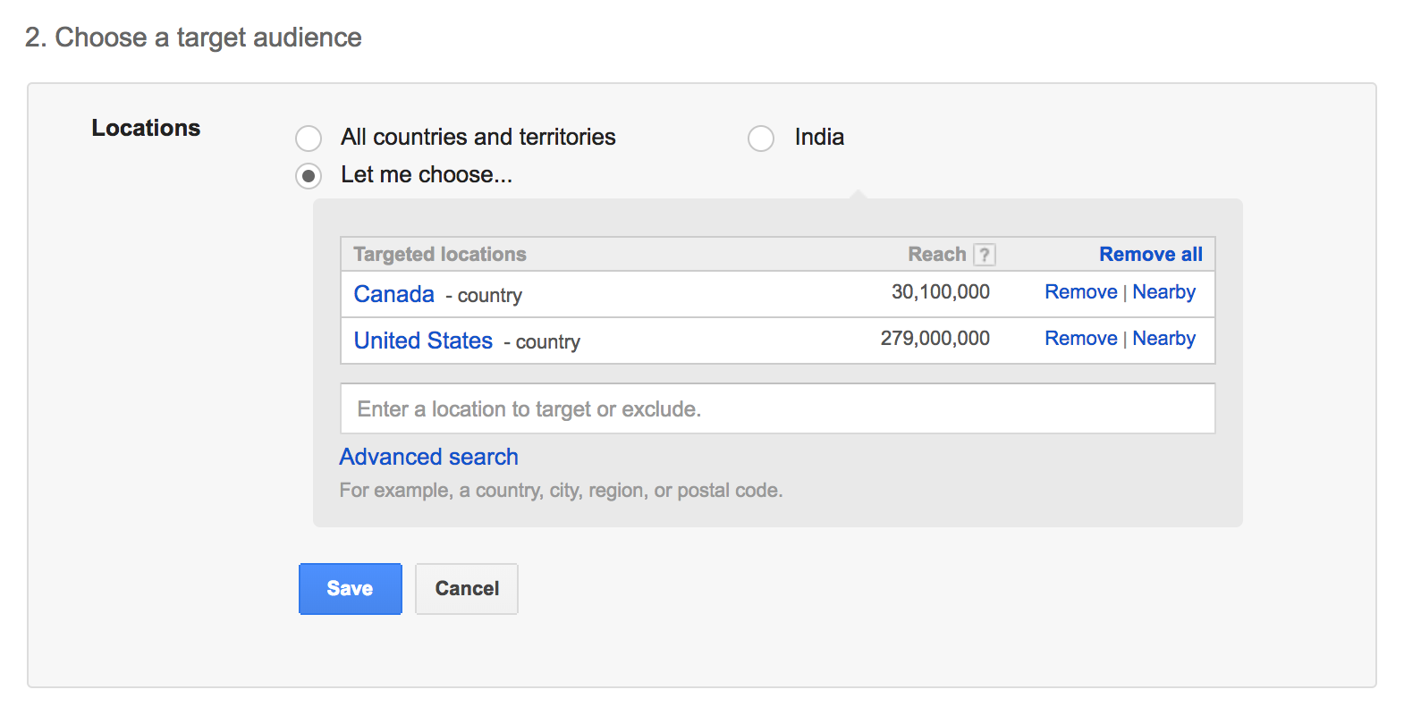 This allows you to target searches coming from specific locations. So if you want to sell primarily to the American and Canadian audience, you can select US and Canada, and your ad will only be shown to them. You can fine tune these and make it extremely targeted, by targeting according to states, cities, provinces, zip codes, etc.
