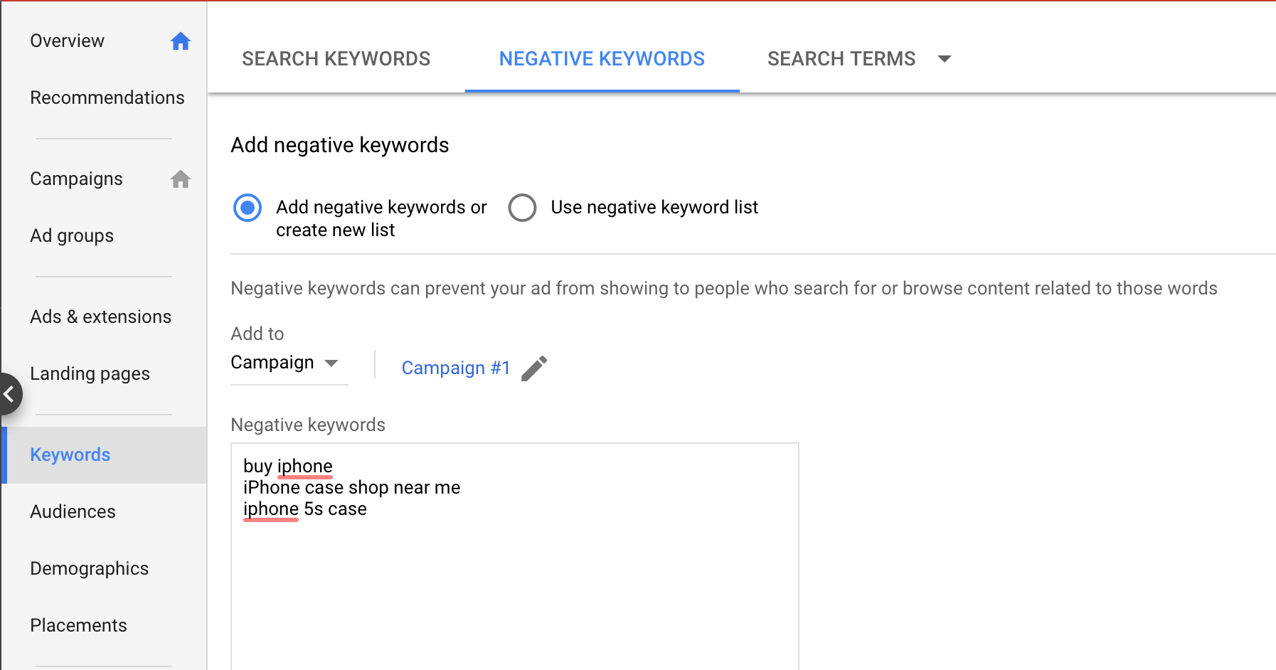 In the box below, enter the keywords you want to run the ad on. Make sure you ignore the Keyword Ideas suggested by Google on the right.