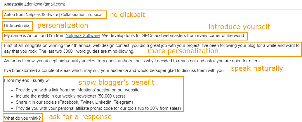 The one thing notable about this guest post pitch by Netpeak software is how they put forth the benefits of guest post collaboration. It’s clearly centered around how the guest post would help the recipient instead of the other way around.