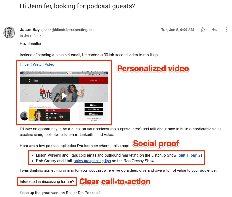 Many businesses are now experimenting with visuals and videos in emails. Outbound Squad takes this further by personalizing the video for the recipient. They also demonstrate social proof to show the recipient that they have delivered high-value podcasts in the past as well.