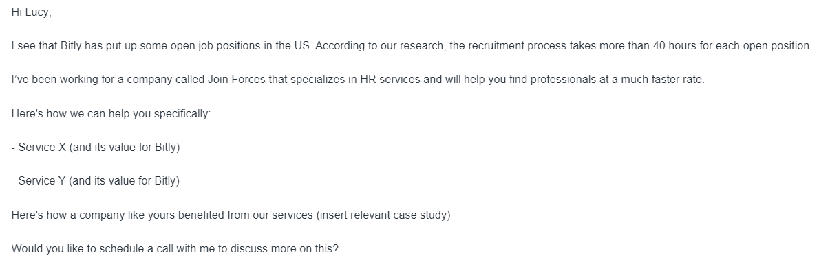 Not only does the sender provide detailed benefits of getting on a call with him, but he also plugs in the recipient’s company name and puts across the value in bullet points that are easy to grasp.