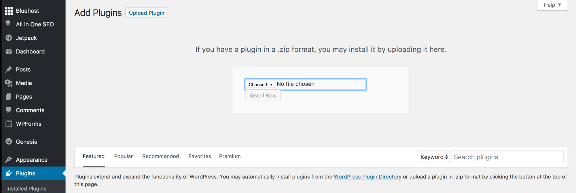 Click on the Upload Plugin button next to Add Plugins. Then click Choose File and upload the plugin file you downloaded.