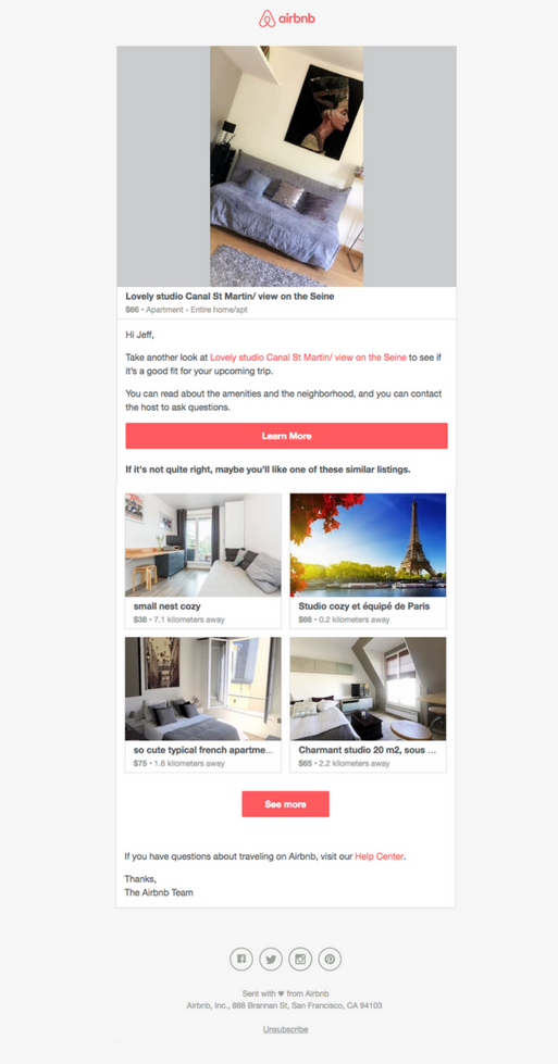 Source: AirbnbThe emails stand out in several ways. To begin with, it directly proposes a property that the user would be interested in the destination that he/she is traveling to. Second, it also offers alternative suggestions that can help the user make a better choice. Additionally, it also takes the user to more Airbnb properties that are personalized to the user’s destination. This is perhaps one of the classic examples of promotional email campaigns.