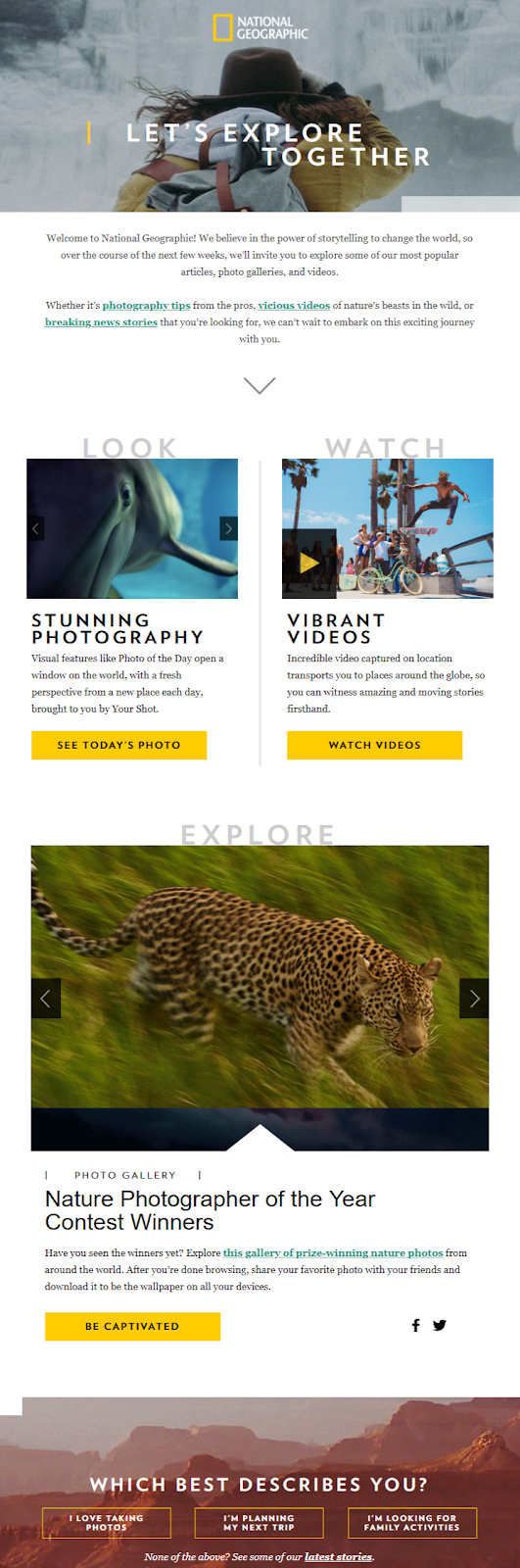 There are countless brands that are doing a fine job with their welcome emails. But, if there is one that creates a great first impression it has to be National Geographic. Their welcome emails are filled with captivating content that hooks audiences and makes them consume it fully. They usually end by nudging users toward photography, travel planning, or family activity content.