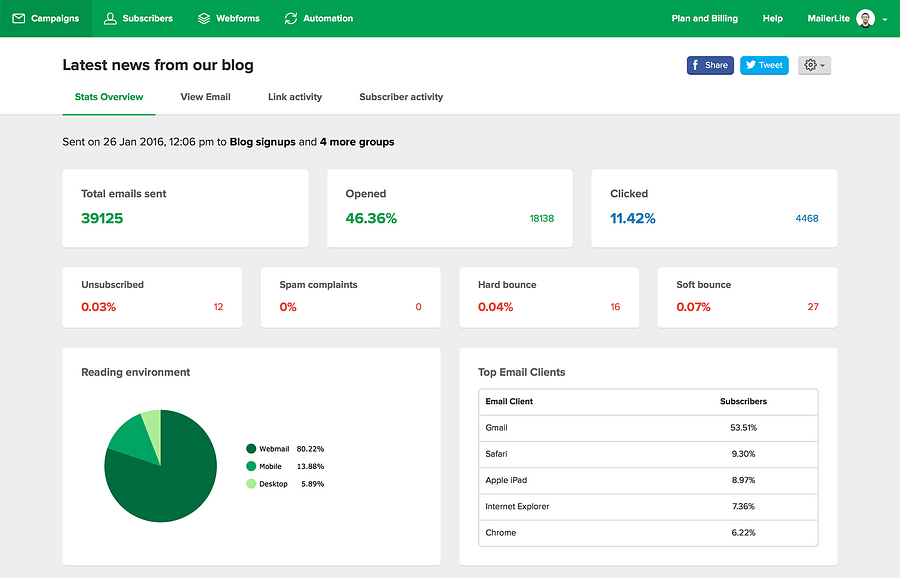 MailerLite is not bad in this chapter, but Mailchimp has one of the most complete reporting systems in the email marketing realm.