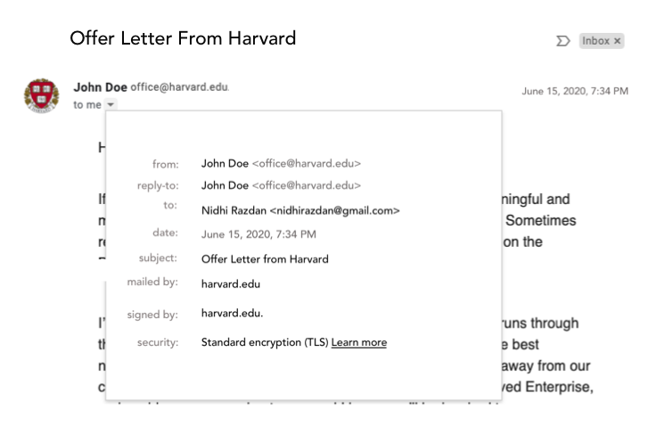 If the emails Nidhi received were actually from Harvard, they should have looked something like this: