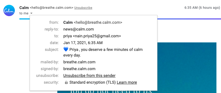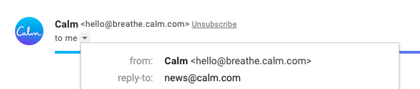 Here is an email that I am sure of coming from breath.calm.com and not from anyone else pretending to be calm. Here we can be sure that person/brand who owns the domain breath.calm.com is the one sending us this email.