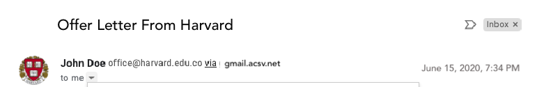 Here is an example. Looking at this sender in your inbox, you will be fooled if you don't pay attention to the domain that is, harvard.edu.co. But the actual domain should just be harvard.edu