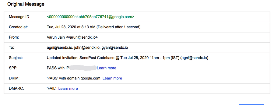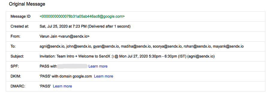Here is our where-were-you-all-this-while screenshotWe sent Calendar invites and noticed the same thing—DKIM passed with the domain sendx.io, and DMARC passed too.