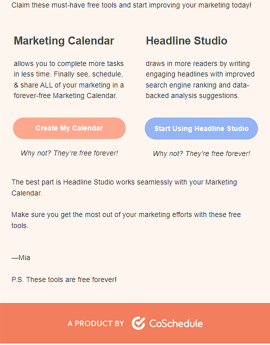 In this email, P.S. was used to reiterate CoSchedule’s free tools to its readers. It works for readers who might not be paying much attention at first read. This reiteration of the main selling point will motivate them to move forward to the next step which is trying out a tool like CoSchedule in this case. Whether that next step is to seek your contact or purchase your product, The best marketing tools for business use a combination of email, website, and SEO strategies. It’s important not to take one of these for granted.