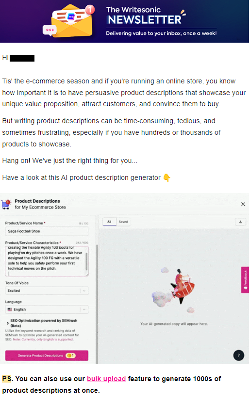 In this example, P.S. at the end of a letter presents the subscribers of Writesonic with a bulk upload feature. This allows them to generate as many as 1000 product descriptions in a single click.