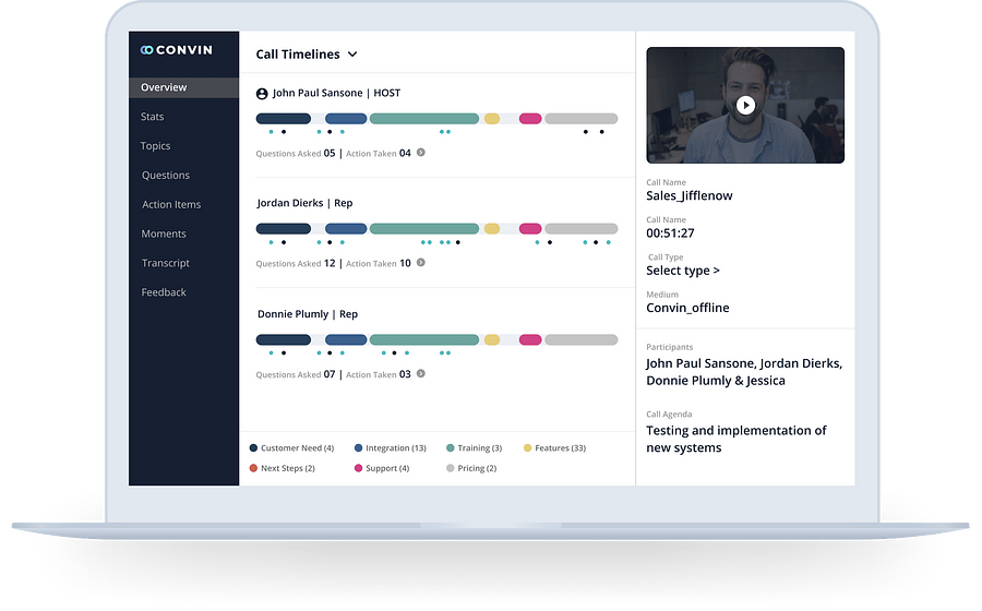 Hippo Video enables your team to close more deals, generate more leads and delight more customers with video starting with a free subscription option, it also offers a 7 day free-trial for its paid pricing models.18. ConvinOrganizations are constantly striving to sell more by understanding what's working on calls, and replicating best performing reps. At the time when most of the sale is remote, recording, transcribing, and analysing all sales calls is next to impossible without the right tool.Convin records, transcribes, and analyses all your sales calls to uncover the black box of calls and tell you what to focus on during calls. It helps you search for anything in the sales call in your dashboard, displays alerts to keep you updated about market trends, and enables you to collaborate and give feedback to your reps.While giving top priority to security, Convin also offers seamless integration with HubSpot, aircall, Google, and quite a few more. It also enables using Conversion Intelligence for call insights, replicating closers, fasttrack onboarding, and market intelligence.