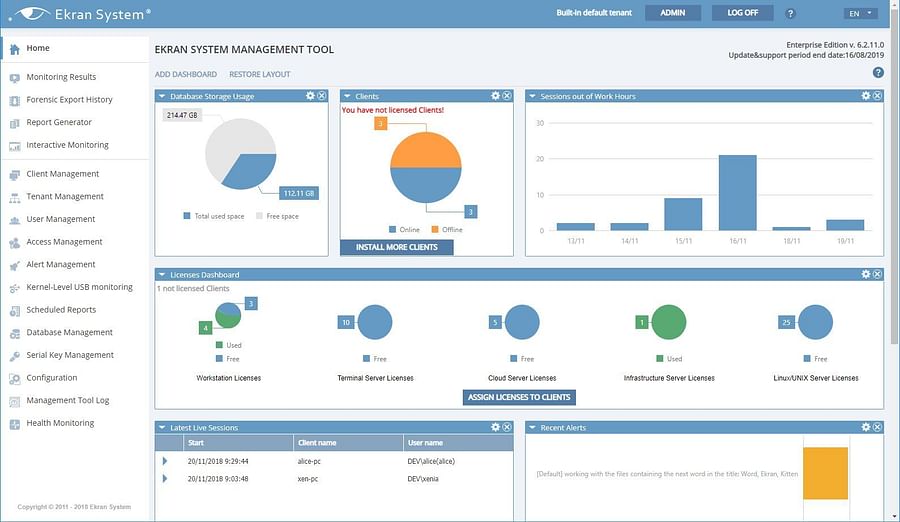 29. EkranSystemEkran System is a cloud-based insider threat detection tool that helps companies monitor user activity, identity management, and privileged access. The platform offers a range of features, including system resource dashboards, browsing history, keystroke logging, time tracking, password management, behavioral analytics, compliance management, and data exports.
