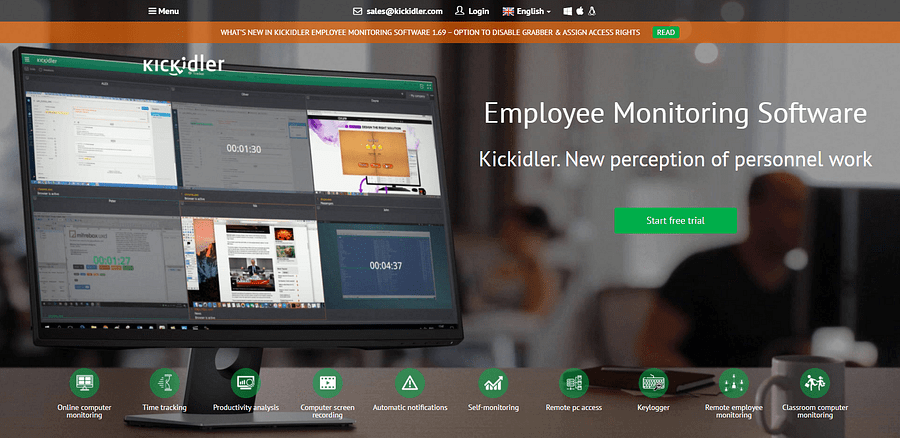 27. KickidlerIf you're looking for remote employee monitoring software that is impossible to trick, then look no further - the answer is Kickidler!In addition to common functions like time tracking, productivity analysis and working time sheets, Kickidler provides the manager with the ability to monitor the screens of all their employees online, check video recordings of their workdays and, thanks to a keylogger, track keystrokes on work computers. In addition, this feature is integrated with video recording, so you can always watch a certain fragment of the video that shows the context in which the employee typed that specific text.In 2020, Kickidler's developers released the new feature of the program titled "AutoKick," which is designed specifically to track remote employees' time. It allows employees to see infographics on their own productivity, receive automatic notifications regarding work schedule violations or overtime hours and enable or disable the program's grabber agent on their own.Prices for Kickidler start at $3, and there are different types of licenses, including unlimited one.