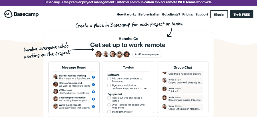 People have the tendency to put the right thing in the wrong places, and this only gets worse when work related information is spread all across emails, spreadsheets, chats etc. It becomes difficult to know where to look for what.Basecamp solves this problem with remote working by combining all the tools teams need to get work done, in a single, streamlined package. Your teams will know what to do, where things stand, and where to find things they need.Basecamp’s features include to-do lists, message boards, documents & file storage, real-time group chat, check-in questions, client access, Hill charts, direct messages, and email forwards.