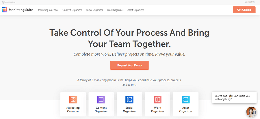 Kontentino offers a 30 day free trial (no credit card required), at a price point of €44 per month, billed yearly.Try it out now!5. CoScheduleIn a remote working setup, where marketing companies are losing control of their marketing process, and struggling to have a consolidated view of all their projects, CoSchedule is a marketing remote working tool which rises to the occasion.CoSchedule gives you instant clarity into all of your projects and helps you confirm you’re working on the right priorities. It removes time wasters so your team can perform to its full potential. Simply put, the CoSchedule marketing remote working tool makes it easy to complete more work, deliver projects on time, and most of all - prove your value.