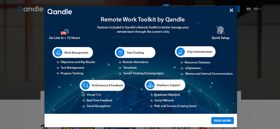 With a pricing model starting at $3 per user per month, it is a very affordable employee-oriented set of remote working tools.10. QandleThe need for sustaining productivity can never be ignored in any type of business. And managing it remotely can be really tricky.Qandle has developed a remote working toolkit which has everything from task management to screen tracking to 1:1s. Qandle’s unique employee productivity toolkit ensures that productivity and effectiveness do not suffer in a remote working environment.It has features that efficiently enable Task Management, Progress Tracking, Remote Attendance management, Screen Tracking, eSignatures, Virtual 1:1s, Real-Time Feedback and Polls and Surveys amongst others.